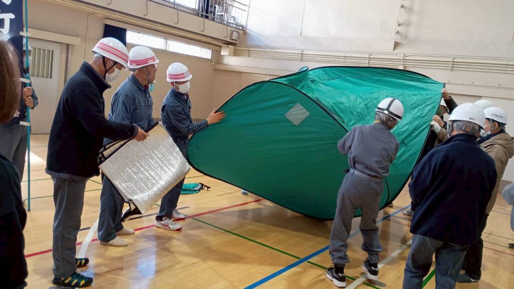 各町内会・自治会が校庭に集合してから体育館に移動して、プライベートテント設営、三角巾の使用法のについて体験しました。