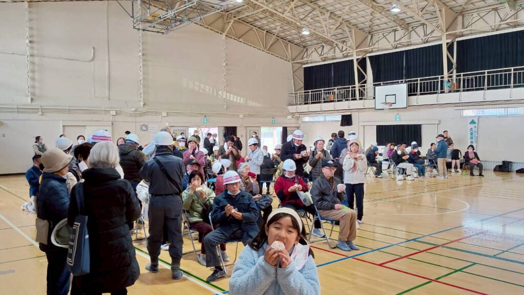 左の写真は、ポータブル電源の紹介です。購入には、市からの助成金も出るそうです。最後は、炊き出し訓練で出されたおにぎりを皆さんで美味しく頂きました。